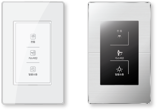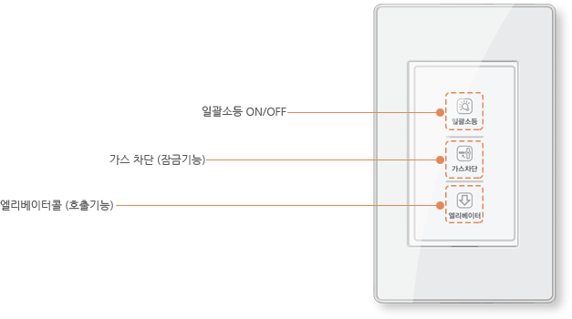 | 종류 | 릴레이 내장형 | 옵 션 | - 가스차단 : 가스밸브 차단기능 - 엘리베이터콜 : 엘리베이터 하강 호출 - 대기전력 차단 : 대기전력차단스위치의 콘센트 OFF - 3로 조명 : 복도전등 3로 ON/OFF |