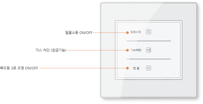 - 외출 시 각각의 스위치를 OFF하는 것이 아니라 현관에 설치된 하나의 일괄소등 스위치를 동작하여 세대 전체의 전등을 소등하는 기능(홈네트워크 연동)을 가지고 있습니다.