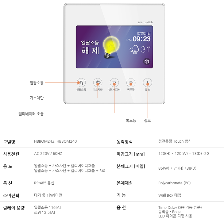 - 일괄소등, 가스차단, 승강기 호출의 기능을 하나의 버튼으로 실행합니다.